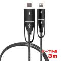 | 仕様・特徴 | コネクタの差し替えで端子を変換!「type-A・type-C・iOS端子」を備えて4通りの充電方法に対応します。全長3mで様々なシーンで取り回しが効く便利な長さです。また、接続中はコネクタが光るので接続できているかどうかの確認も簡単です。1本あると便利なケーブルをスマートに備えよう! ・2コネクタ×2タイプで端子変換 ・充電方法4通り(Type-C×Type-C、Type-C×iOS専用端子、Type-A×Type-C、Type-A×iOS専用端子) ・USB2.0 ・データ転送可能 ・コネクタが光る ・ケーブルは断線しにくいナイロンメッシュ構造 ※ご使用前に必ずパッケージ記載の「注意」「商品取り扱いに関する注意事項]等をよくお読みください。 |